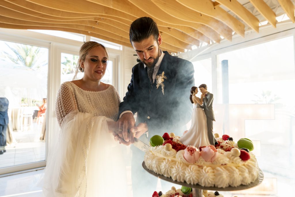 Boda en Almuñécar. Alejandro y Patricia. Fotografías en la fiesta. Tarta y baile. Boda realizada el Almuñécar.